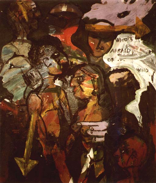Fotograf: Eget foto Værk titel: Antiracisme Værk type: Maleri Materiale: Aceyl, olie, kul på plade Færdiggjort: 1990 Placering: Lyngåskolen, Skejby