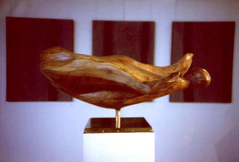 Fotograf: Terkel Grum-Schwensen Værk titel: Fugl - svævende figur Værk type: Skulptur Materiale: Blommetræ Størrelse: 128 cm med sokkel Færdiggjort: 1986