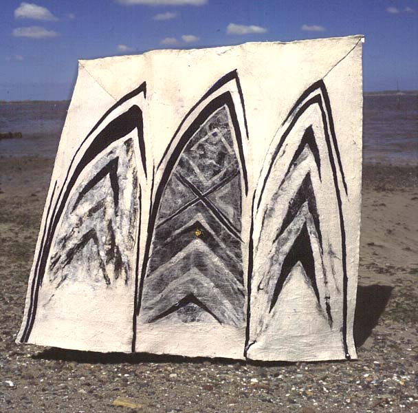 Fotograf: Leif Hansen, Odense Værk titel: Fugle og Sjæle vender tilbage Værk type: Filtet billede - vægophængt Materiale: Filtet uld, gouache Størrelse: 200 x 200 cm Færdiggjort: 1995