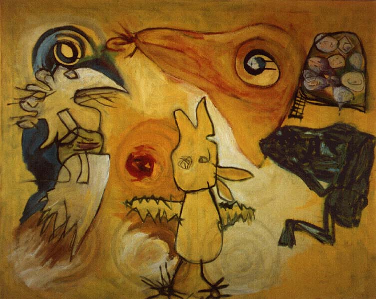 Fotograf: Eget foto Værk titel: Hønsegården Værk type: Maleri Materiale: Olie på lærred Størrelse: 100x120 cm Færdiggjort: 1989 Placering: Lyngåskolen, Skejby