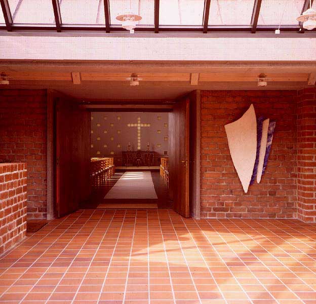 Fotograf: Leif Hansen, Odense Værk titel: Skjold Værk type: Skulpturelt ophæng Materiale: Filt (uld, hør, silke) Størrelse: 170 x 90 cm Færdiggjort: 1992 Placering: Hans Tavsens Kirke, Odense